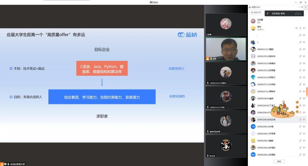 讲座中,李亮整体分析了2023届毕业生的考研与就业形势,就如何在快速迭代的互联网行业立足、国内一线互联网企业用人标准、学生自身学历、技术能力应该匹配哪些互联网企业等问题进行了深入详细的讲解,同时针对同学们的情况进行了一些行业名企就业岗位推荐。
