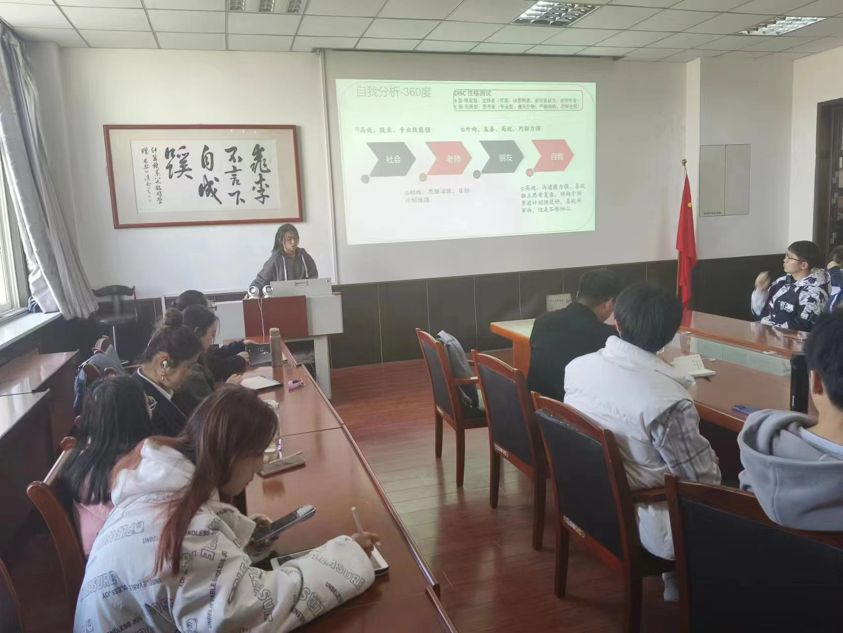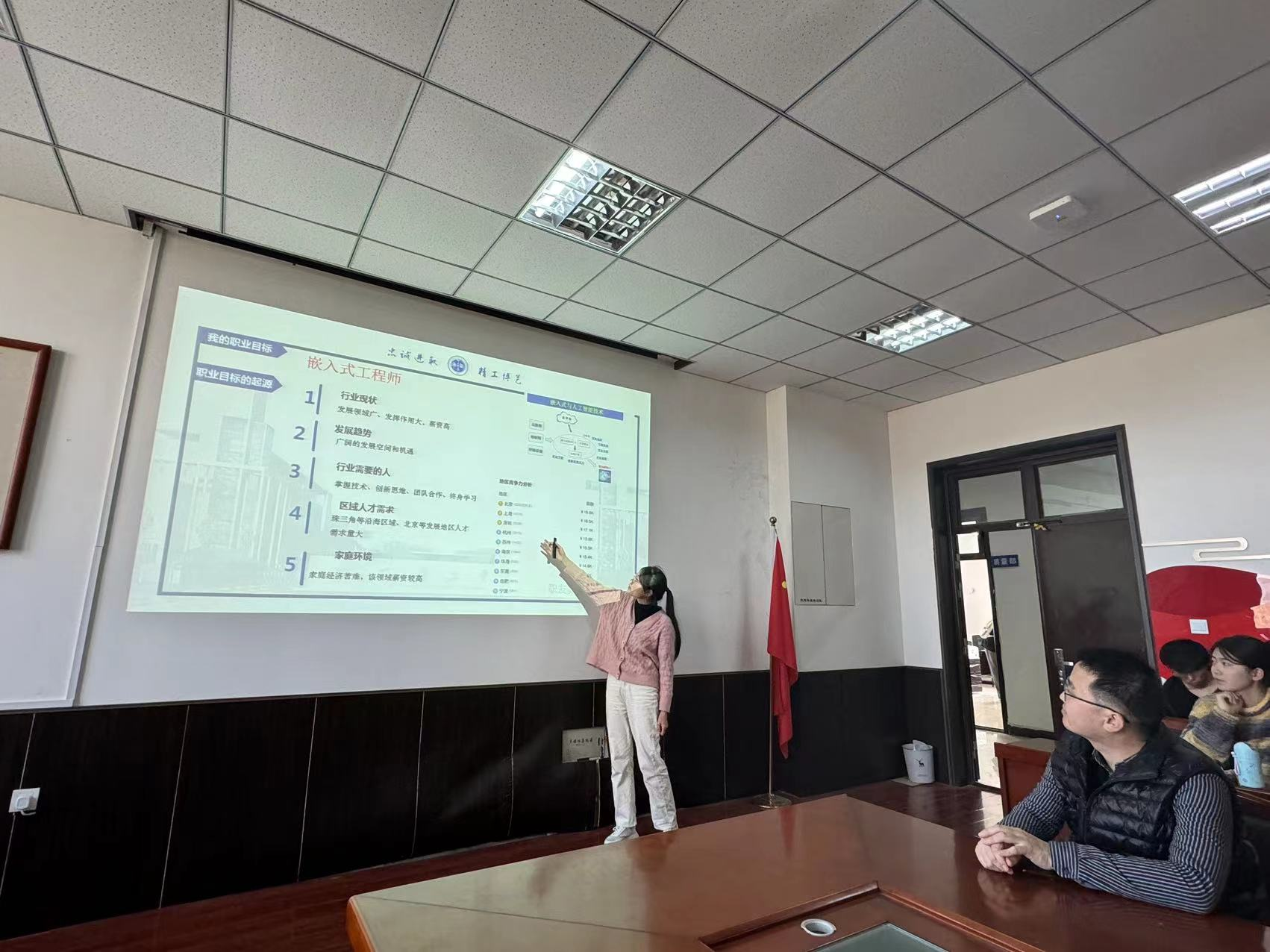 学院路演由学院全体学工干部担任评委,比赛采取PPT展示+评委提问的方式。各参赛学生从自我认知、职业认知、胜任能力、荣誉展示、职业经历、未来规划等方面,分析自身职业认识,职业规划;结合家庭、社会、个人三个维度,明确自身职业目标,并制定短期、中期和长期计划,呈现出一幅幅生动的生涯成长画卷,展现出对自身明确的定位认知和正向积极的价值追求。
