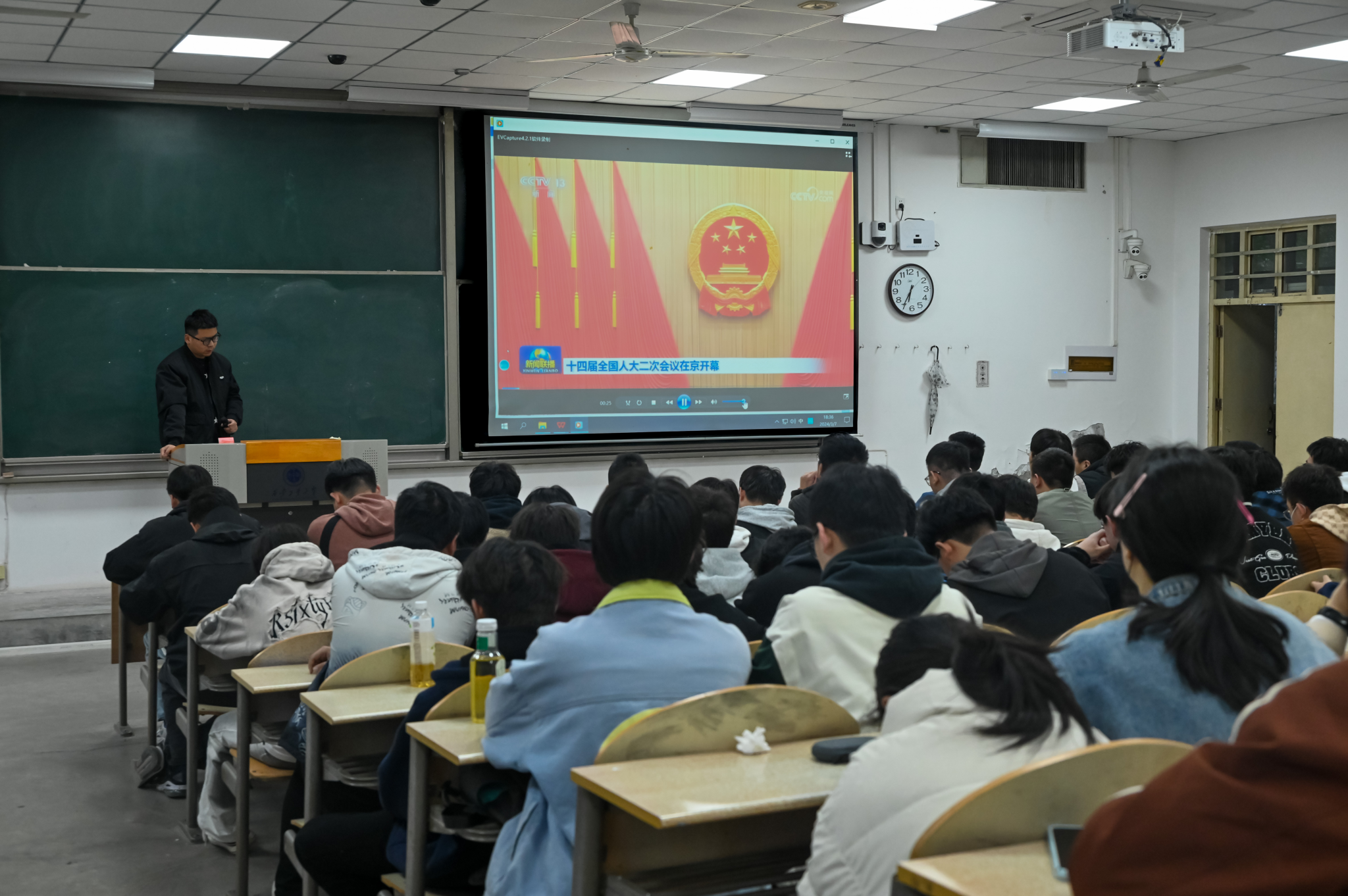为深入学习贯彻“两会”精神,全方位、多角度把握两会动态,提高大学生的思想觉悟,强化新时代青年的使命与担当,3044永利集团于3月6日晚18点30分在教1-102组织学生集体观看第十四届全国人大二次会议开幕式并学习2024政府工作报告的主要内容。
