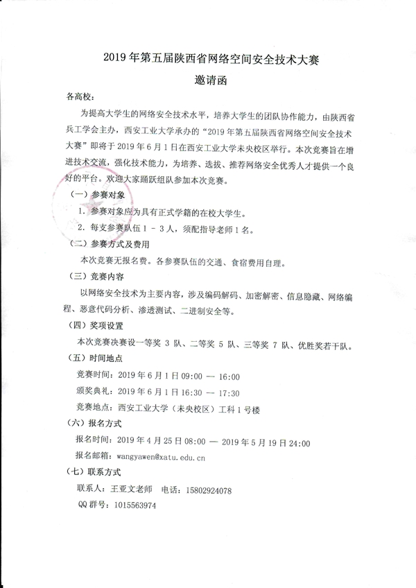 为提高大学生的网络安全技术水平,培养大学生的团队协作能力,由陕西省兵工学会主办,永利集团3044承办的“2019年第五届陕西省网络空间安全技术大赛”即将于2019年6月1日在永利集团3044未央校区举行。本次竞赛旨在增进陕西省内外高校之间的技术交流和学习,强化技术能力,为培养、选拔、推荐网络安全优秀人才提供一个良好的平台。欢迎大家踊跃组队参加本次竞赛。