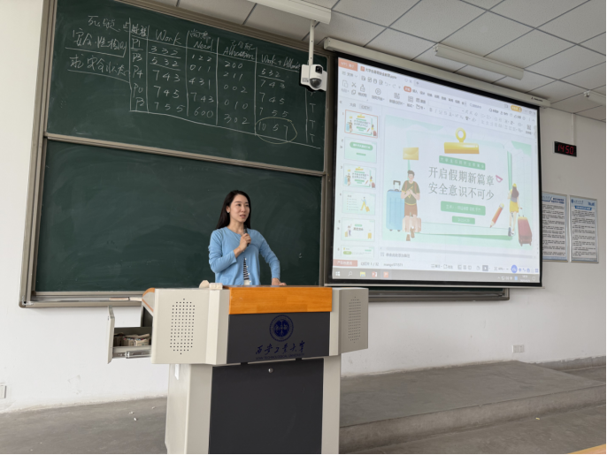 会上,呼延晓蓉老师围绕五一假期安全作专题教育,结合典型案例从交通安全、防溺水、防盗防诈、宿舍消防安全等方面展开讲解,强调“离校报备、返校销假”制度,要求全体学生保持通讯畅通,谨记“安全无小事”。李凯老师补充说明学校假期管理规定,提醒学生严格遵守属地法律法规,不参与高风险活动,确保平安度过假期,返校后进行晚点名制度。