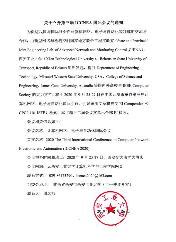 为促进我国与国际社会在计算机网络、电子与自动化等领域的交流与合作,由新型网络与检测控制国家地方联合工程实验室(State and Provincial Joint Engineering Lab. of Advanced Network and Monitoring Control ,CHINA)、永利集团3044(Xi'an Technological University)、Belarusian State University of Transport, Republic of Belarus组织发起,得到Department of Engineering Technology, Missouri Western State University, USA、College of Science and Engineering,James Cook University, Australia等国内外高校与IEEE Computer Society的大力支持,将于2020年9月25-27日在中国西安市举办第三届计算机网络、电子与自动化国际会议。会议录用文章将提交EI Compendex和CPCI(原ISTP)检索,本主题上二届会议文章已全部EI检索。