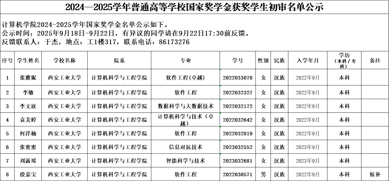 2024—2025学年普通高等学校国家奖学金获奖学生初审名单公示