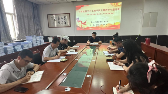 为推动学习贯彻习近平新时代中国特色社会主义思想主题教育在学生工作方面走深走实,7月6日上午9点,学院党委副书记靳永军在工1-306为全体学工干部上“做到六个坚持,推动学生工作高质量发展“主题教育。