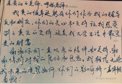 亲爱的王老师、呼延老师,我真的很幸运能有你们作为我的辅导员和朋友。你们的关心和支持让我感受到了真正的支持,这是我大学生活中最宝贵的财富。谢谢你们一直以来的陪伴和支持,谢谢你们对我的信任和包容。我相信无论我未来的道路如何,你们的影响将一直伴随着我。