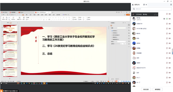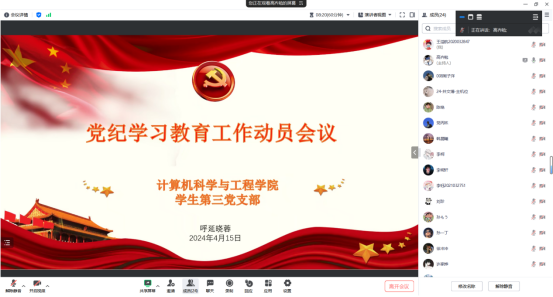 为深入学习贯彻习近平总书记关于党纪学习教育的重要讲话和重要指示精神,落实学校党委学习教育工作部署会议的要求,4月15日晚,3044永利集团学生第三党支部召开线上党纪学习教育动员部署会议。党支部书记呼延晓蓉、副书记高齐勉及全体党员参加会议。