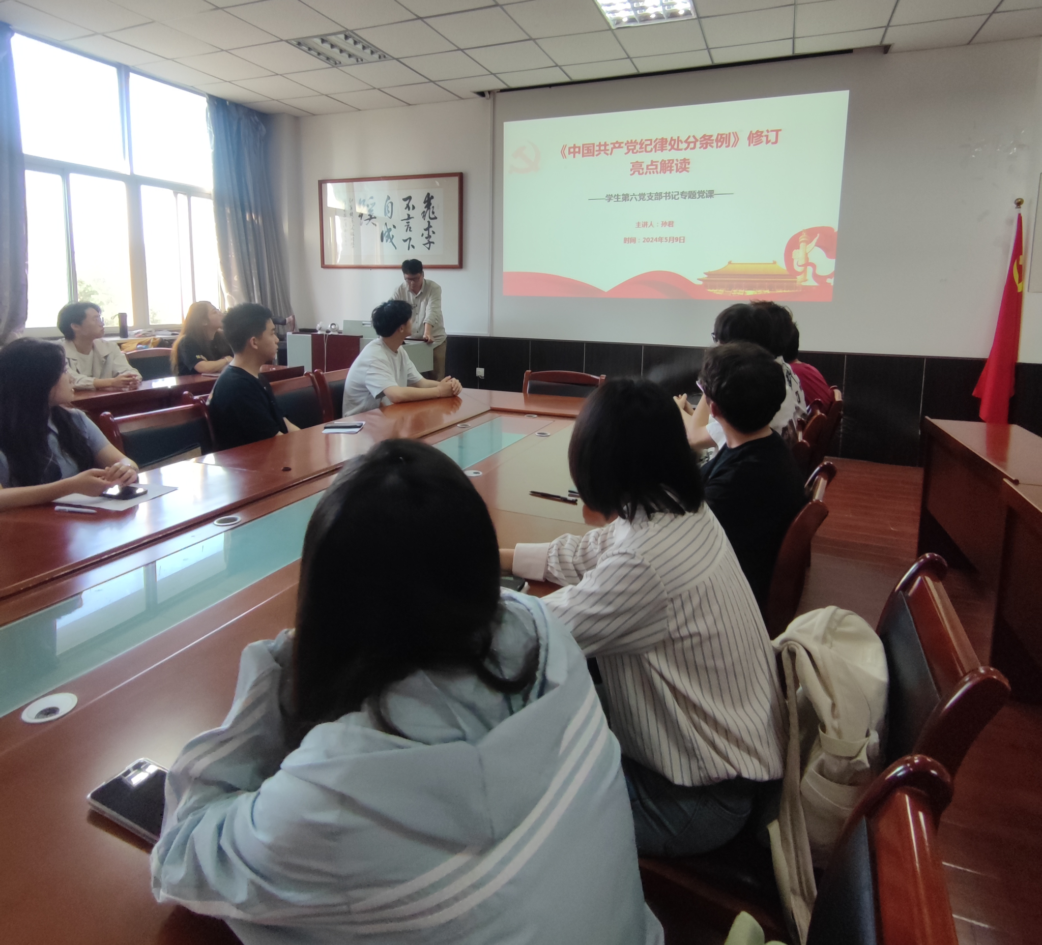 支部书记孙君首先传达了《关于在全校开展党纪学习教育的工作方案》以及《关于做好近期党纪学习教育有关工作的提醒》文件的有关内容和要求。接着,孙君在会上做党纪学习教育专题党课,着重讲述《中国共产党纪律处分条例》修订中的八个方面的亮点解读,指出此次党纪学习教育是贯彻全面从严治党战略方针、落实新时代党的建设总要求的重要举措。