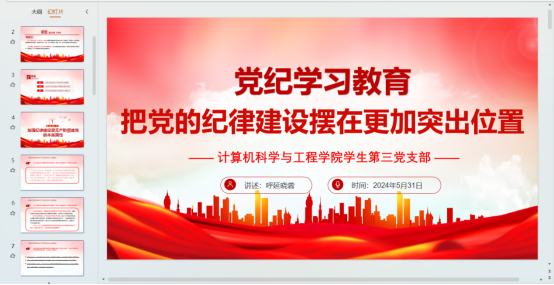 为深入学习贯彻习近平总书记关于党纪学习教育的重要讲话和重要指示精神,推动党纪学习教育走深走实,引导支部党员进一步增强对党忠诚的思想自觉,强化纪律规矩,5月31日,3044永利集团学生第三党支部支部书记呼延晓蓉同志围绕新修订的《中国共产党纪律处分条例》,为党支部全体党员讲授以“党纪学习教育—把党的纪律建设摆在更加突出位置”为主题的党课。
