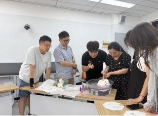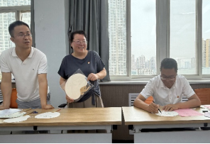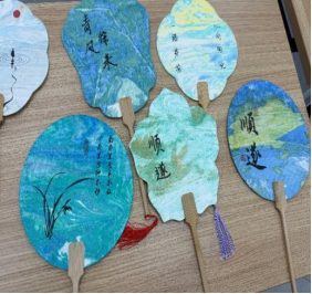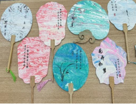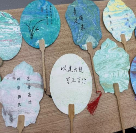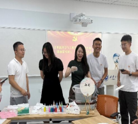 随后,在活动实践环节,非遗漆扇吴丹老师现场授课,将传统工艺与廉政文化进行深层联结,吴老师从漆扇扇骨选材到漆面髹涂的工序步骤进行详细讲解。在他的指导下,师生党员以扇面为载体以廉政格言、警句和寄予期望为主题进行创作。在制作环节,大家精心挑选着各种钟意的扇形和色彩,书写下扇面主题,再轻轻地将漆料滴入水中,用搅拌棒缓缓搅动。当漆画在水中幻化出五彩斑斓的纹路时,将扇子缓缓浸入水中,轻轻旋转,慢慢抽出,这时一把把独一无二、晕染天成的漆扇就完成了。这一把把漆扇五彩斑斓的纹路交织错落,有的细腻飘逸,有的自然粗犷,师生们都兴奋地展示自己的作品,整个现场其乐融融,欢声笑语。