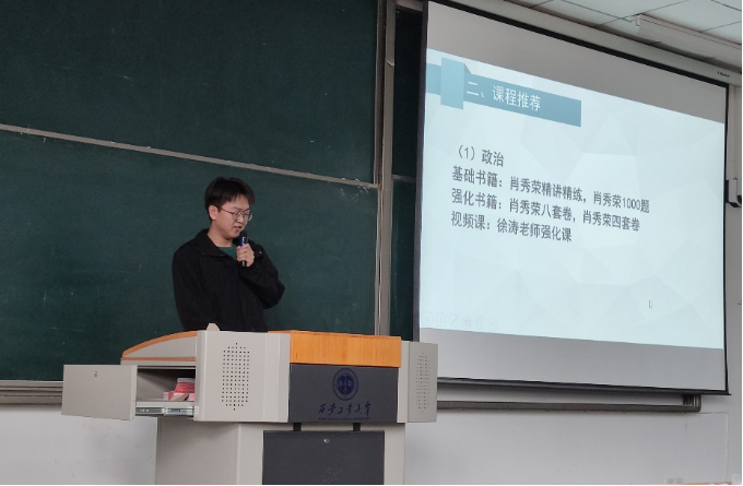 第三位分享者是我院2019级软件工程专业学生杜佳佳,他为同学们进行考研经验的分享,他分别从政治,低投入高回报地学习;英语,背大作文,小作文,十篇凑一篇;数学,复习容易焦虑,我们要走质不走量,要会;专业课,参考王道考研课程学习等多个角度全方位地指出自己的经验教训,分析考研形势,引导方向,做出建议,使同学们对考研过程有了一个更具体、更清晰的认识,帮助以积极乐观的心态和良好的方法迎接考研这一巨大挑战,扫除沿途障碍,一战成硕!