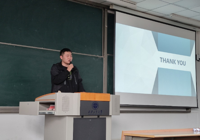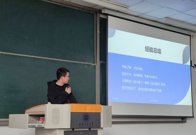 第四位分享者是我院2019级学生孟瑞杰,他指出打算就业的同学可以实习等秋招或者实习一年转正。他说分配到的面试岗位是很重要的,所以我们一定要重视求职就业的各个环节。我们要注意简历照片要证件照,要很标准的,不可以敷衍了事,同时也要注意面试用语,给面试官留下好的印象,简历就是要体现个人能力的,他认为竞赛获奖>项目经历>实习经历。最后鼓励学弟学妹用坚持不懈的行动和艰辛的汗水追逐个人理想。