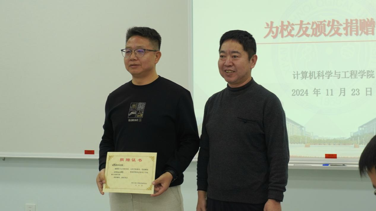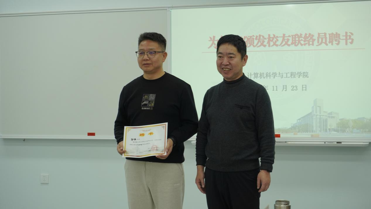 期间,返校校友们集体认捐了双创楼报告座椅冠名项目,王守民为该班级颁发了捐赠证书,并校友郭伟颁发了00605班校友联络员聘书。